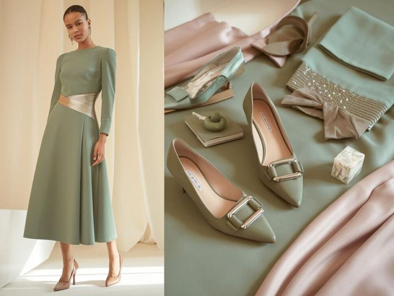 - Pastelowe buty w odcieniach pudrowego różu – delikatne uzupełnienie zielonej sukienki.