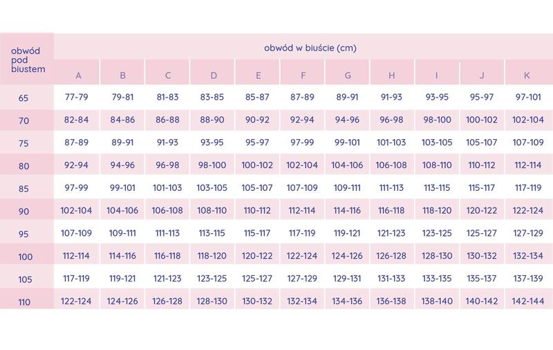 | Obliczenie różnicy | Odejmij obwód pod biustem od obwodu w biuście, co wskaże literę miseczki. |