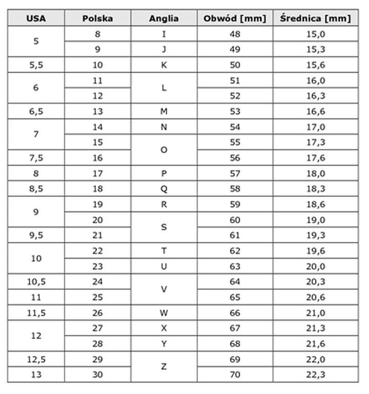 Kolejna skuteczna metoda polega na skorzystaniu z gotowej tabeli rozmiarów pierścionków. Zmierz obwód palca, a następnie porównaj go z tabelą – to naprawdę ułatwia ustalenie, jaki rozmiar pierścionka będzie najbardziej odpowiedni. Warto również pamiętać, że w przypadku zakupu szerokiej obrączki lepiej wybrać większy rozmiar w porównaniu do wąskiego pierścionka; szerokości naprawdę mają znaczenie! Dodatkowo rozmiar może się różnić w zależności od ręki. Tak, zazwyczaj dominująca ręka ma szersze palce. Dlatego przed zakupem pierścionka upewnij się, na którym palcu zamierzasz go nosić!