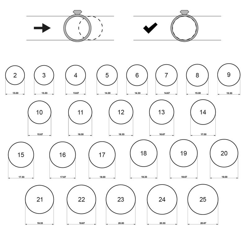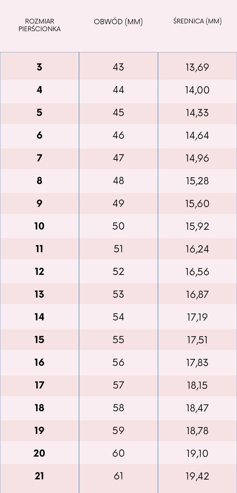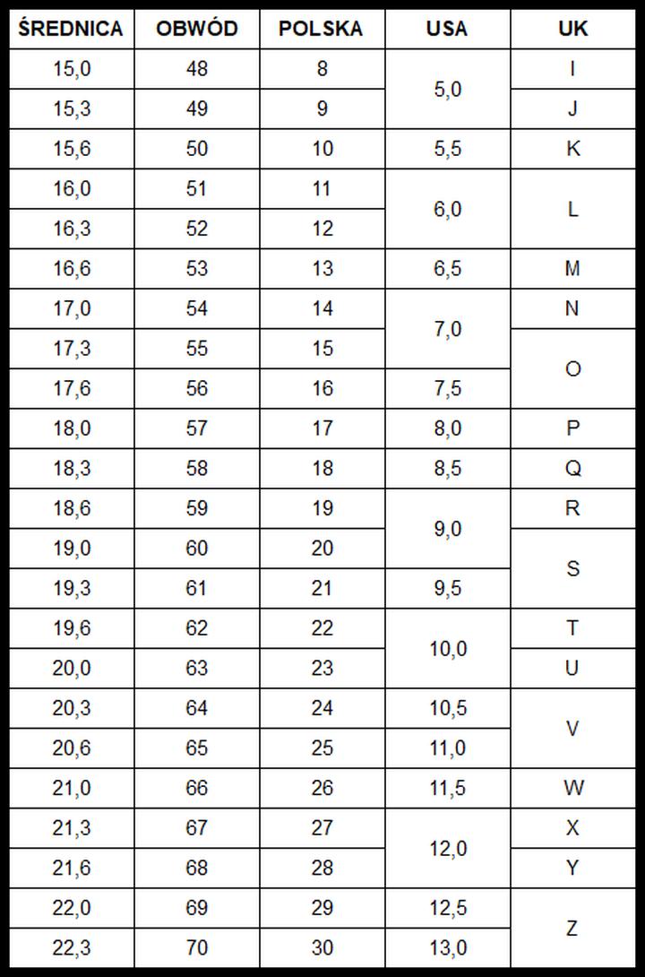 • Szerokie obrączki wymagają wyboru większego rozmiaru w porównaniu do standardowych pierścionków.