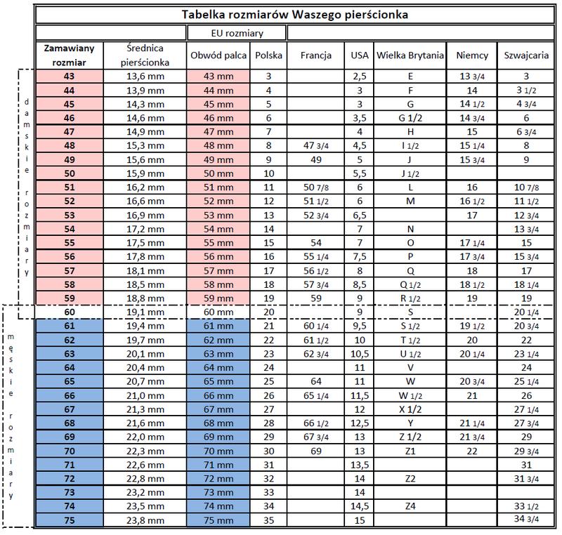 - Znajdź tabele rozmiarów odpowiednie dla krajów, z których pochodzą pierścionki.