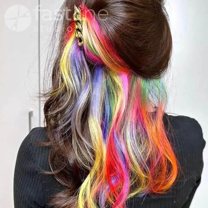 - Ukryte farbowanie to technika polegająca na farbowaniu dolnych warstw włosów w odważne kolory, przy zachowaniu naturalnych odcieni na górze.