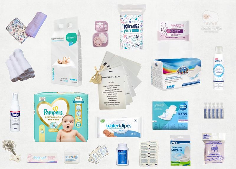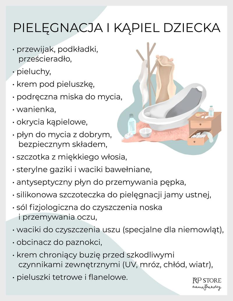 - Lista must-have dla wyprawki obejmuje bodziaki (6 sztuk), pajacyki (4 sztuki) oraz kocyki (2 sztuki).
